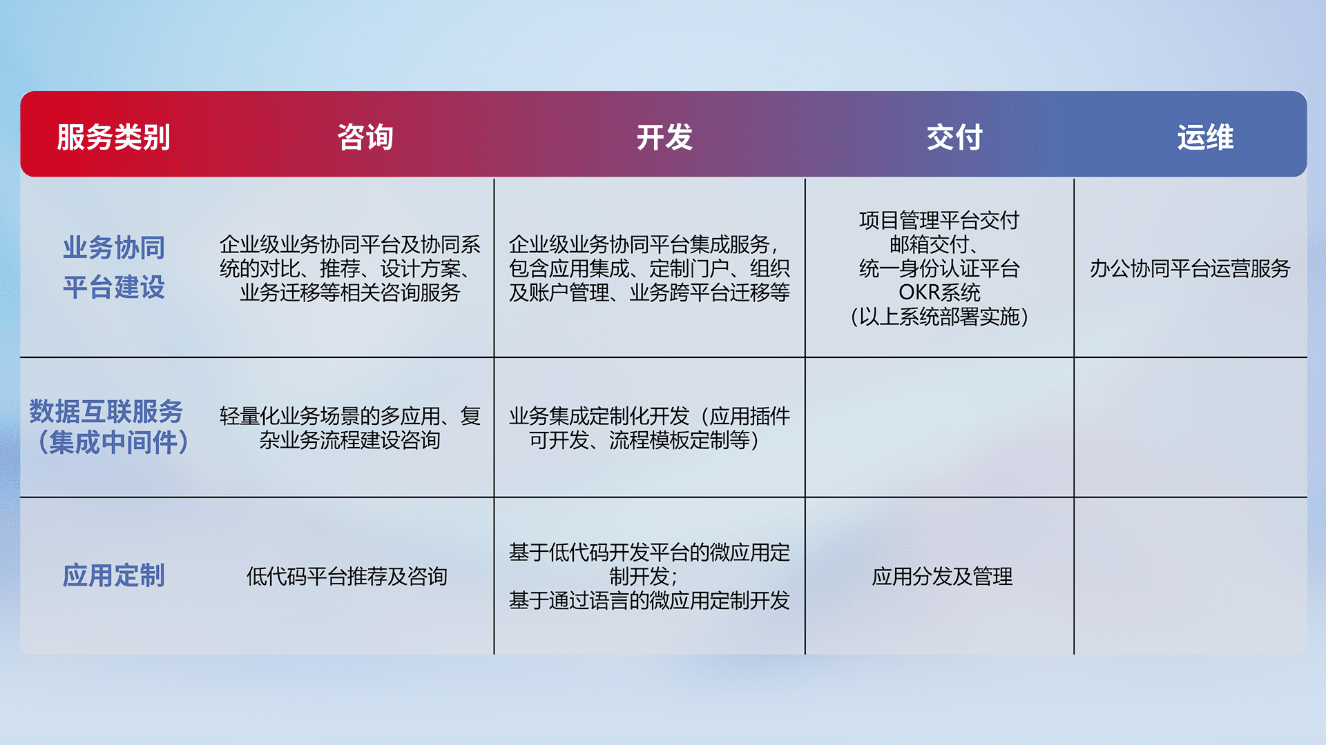 针对钉钉、、企微、、、、IDaas等平台级产品提供产品的规划、、方案、、、交付、、、、定制化开发等服务,,,,实现如统一协同办公、、、智能客户服务、、、、混合会议管理、、、智能数据查询、、、、等业务场景,,,,实现数字化转型。。。。